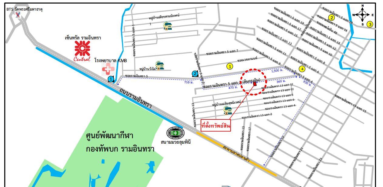 - 1.3 K.m. จากสถานีรถไฟฟ้าสายสีชมพู สถานีรามอินทรา ซอย 3