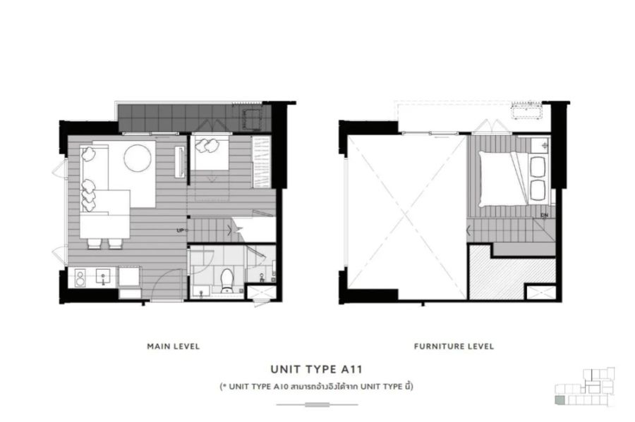 - Type: 1 Bed Plus (A11) พื้นที่ใช้สอย 33.57 + 8.50 (ชั้นลอย)