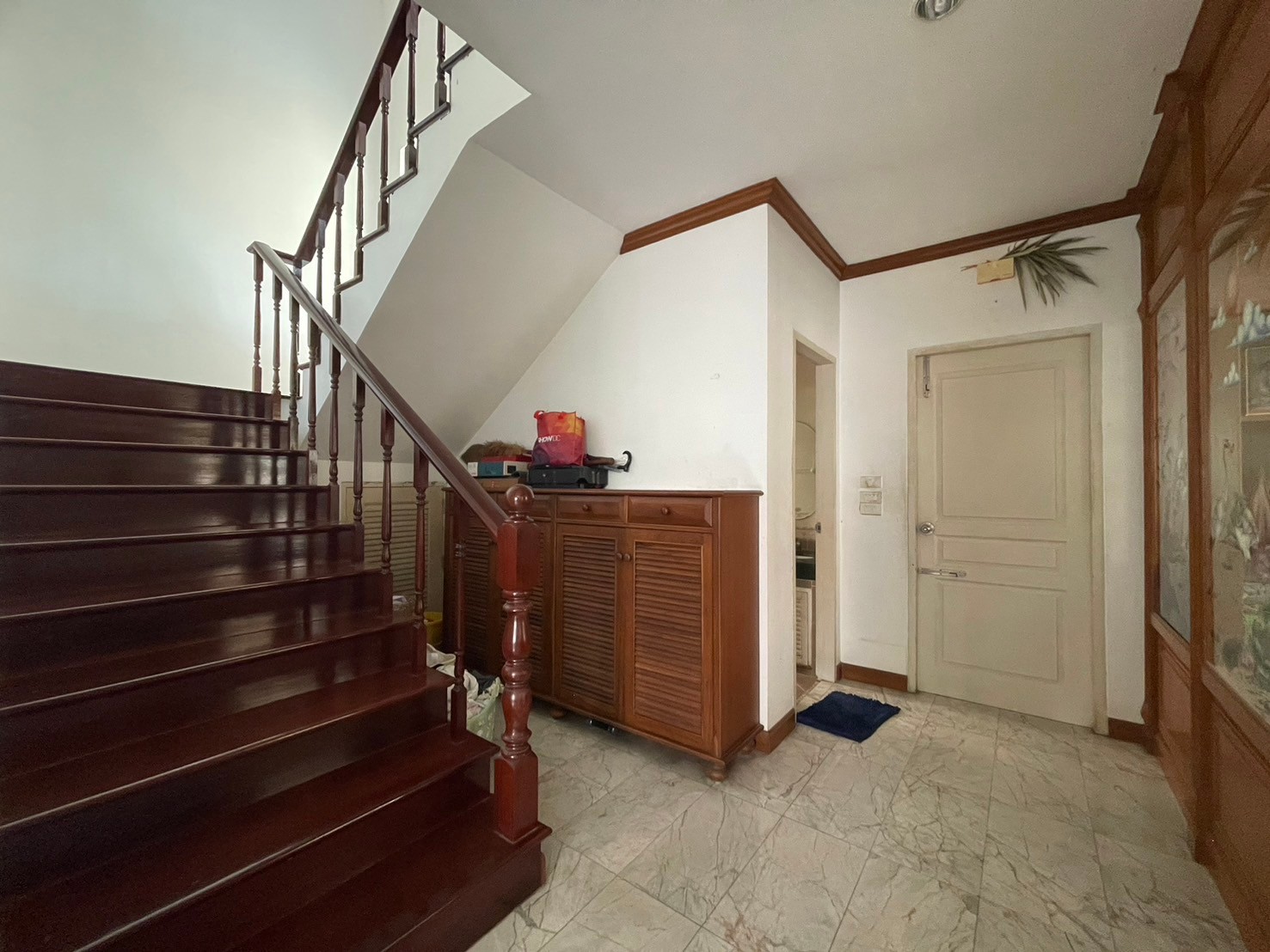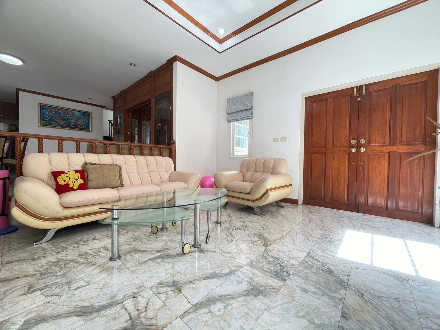 - ชั้นล่างปูหินอ่อน ชั้นบนปูปาเก้ลายไม้